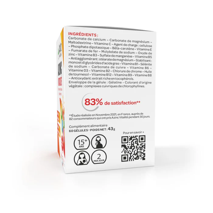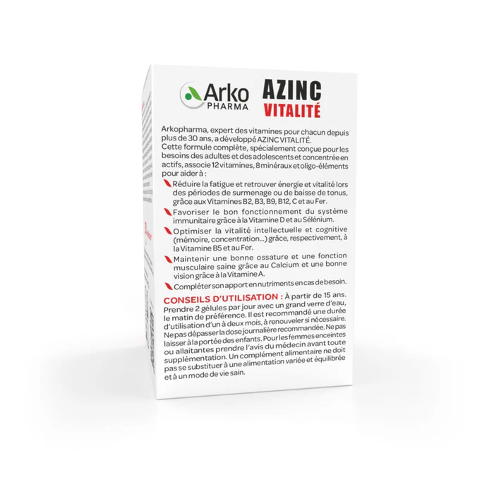 Azinc® Vitalité gélules a été tout spécialement formulé pour répondre aux besoins des adultes et des adolescents dont le rythme de vie très actif peut conduire au surmenage, et à des états de fatigue et de déséquilibres nutritionnels passagers.