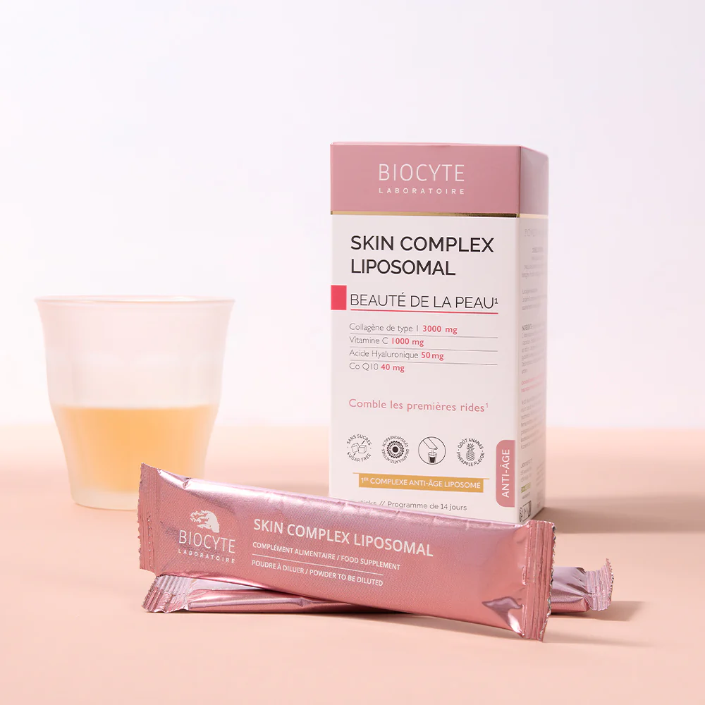 Biocyte Skin Complex Liposomal 14 Sticks est un complément alimentaire à base de collagène, de vitamine C, d’acide hyaluronique et de coenzyme Q10, avec des édulcorants.