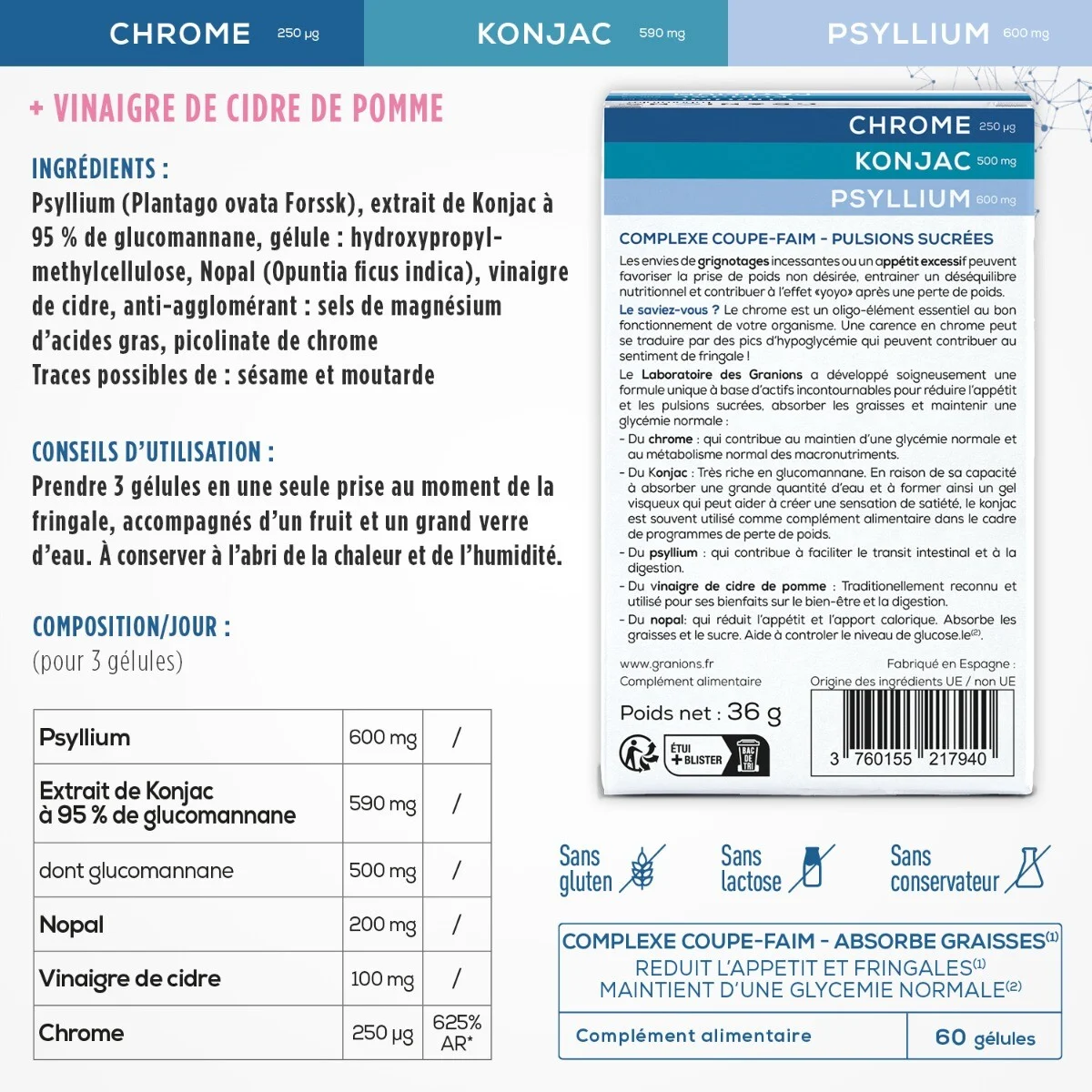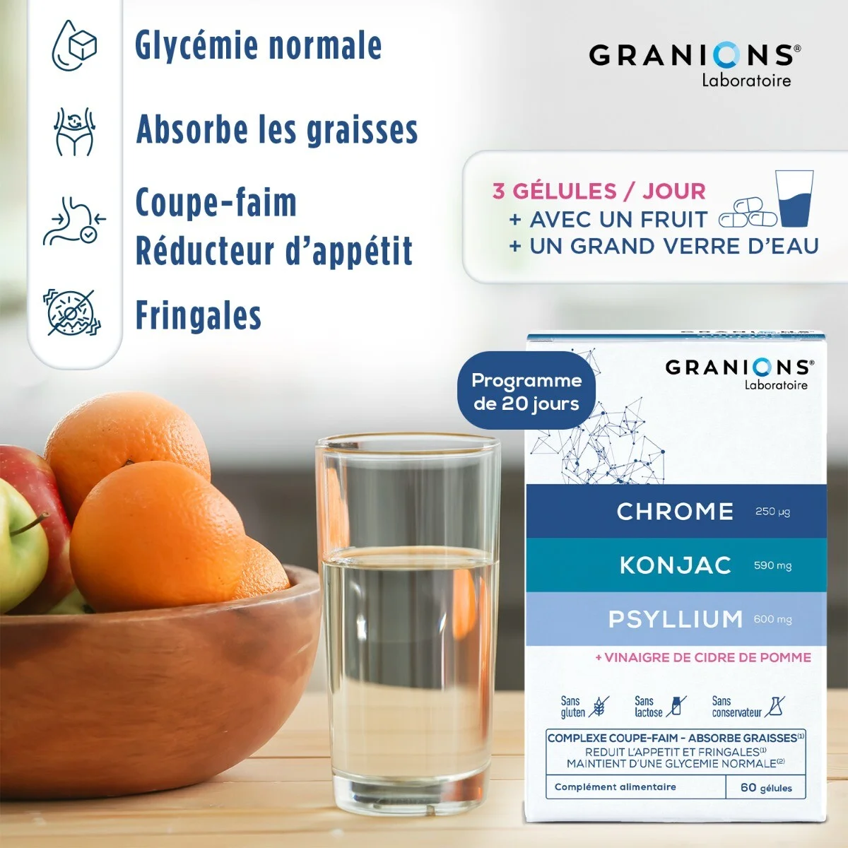 Les envies de grignotages incessantes ou un appétit excessif peuvent favoriser la prise de poids non désirée, entraîner un déséquilibre nutritionnel et contribuer à l’effet «yoyo» après une perte de poids. Le Laboratoire des Granions a développé soigneusement une formule unique à base d’actifs incontournables pour réduire l’appétit et les fringales, absorber les graisses et maintenir une glycémie normale :