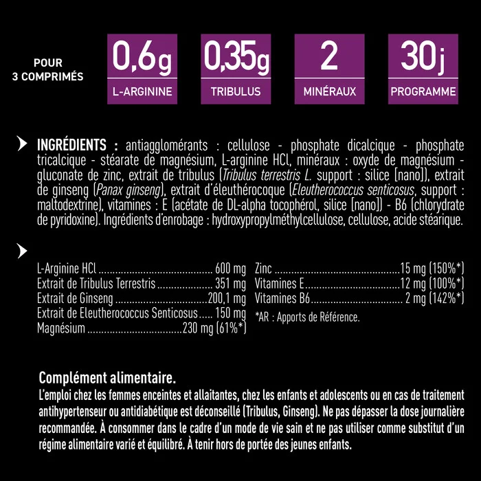 - Dosage recommandé : Prendre 3 comprimés par jour, de préférence avant les repas ou avant l’exercice, avec un grand verre d’eau.