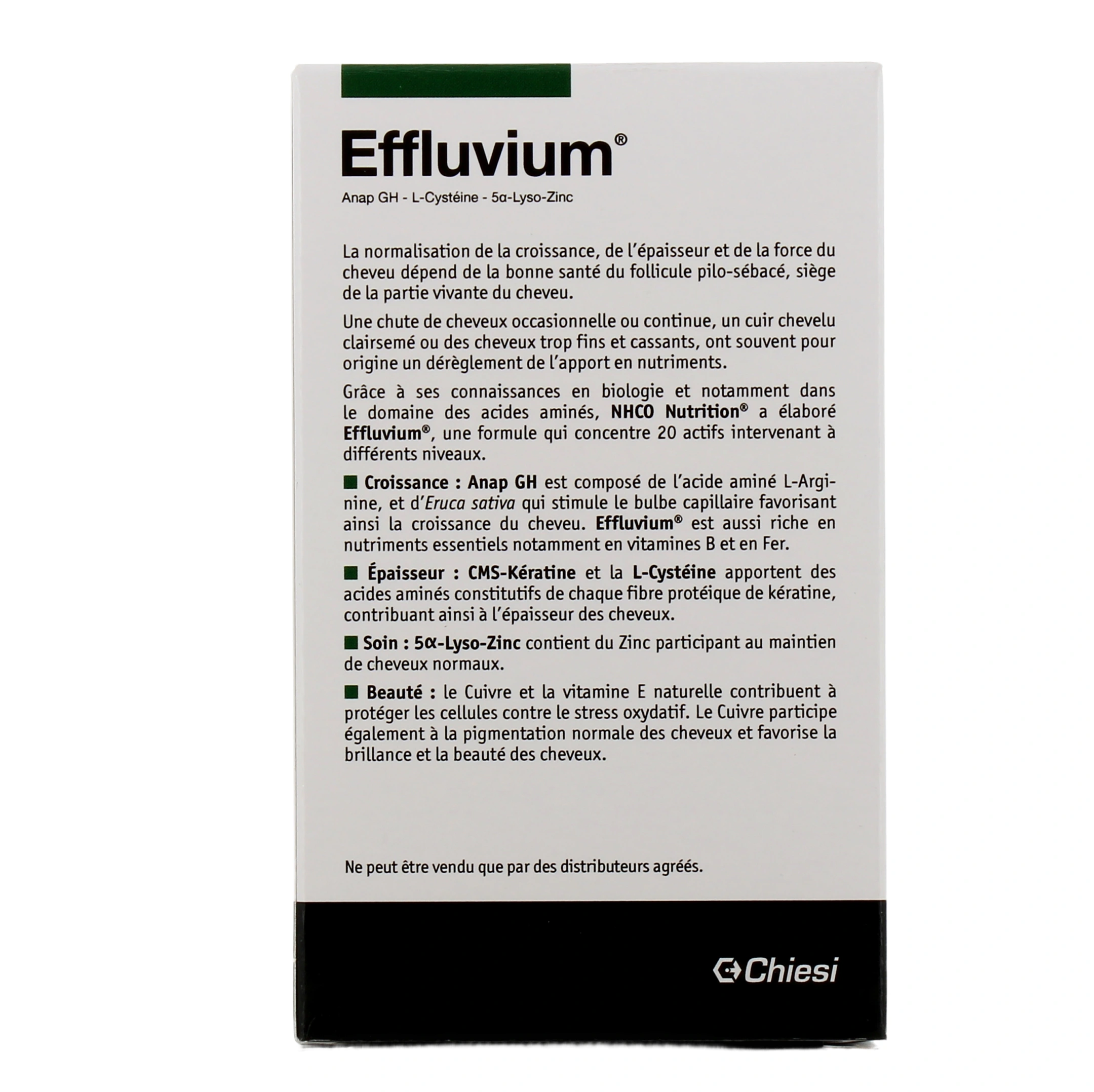 Grâce à leurs connaissances en biologie et notamment dans le domaine des acides aminés, les Laboratoires NHCO Nutrition® ont élaboré EFFLUVIUM®, une formule qui concentre 20 actifs intervenant à différents niveaux.