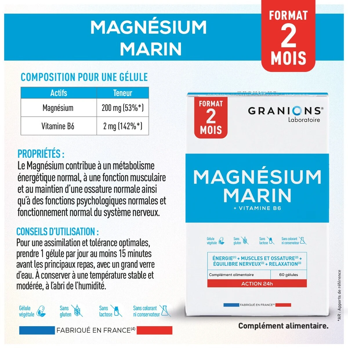 Granions Magnésium Marin 200 mg, en gélules, est conçu pour vous aider à réduire la fatigue, tout en soutenant les fonctions nerveuses, musculaires et psychologiques.