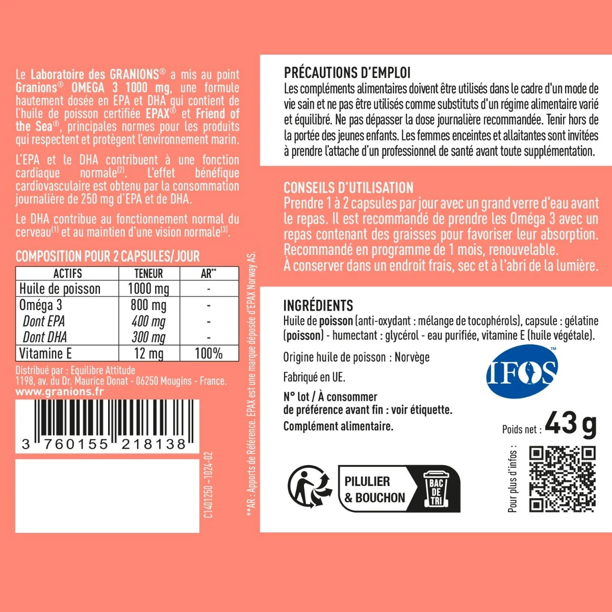 Granions Omega 3 1000 mg est un complément alimentaire conçu pour soutenir la santé cardiovasculaire, le fonctionnement du cerveau et le maintien d’une vision normale. Grâce à une haute concentration en acides gras essentiels EPA et DHA, ce produit est idéal pour ceux qui souhaitent bénéficier des bienfaits prouvés des Oméga-3 tout en respectant l’environnement. Certifié EPAX® et Friend of the Sea®, il garantit une pêche durable et responsable, contribuant ainsi à la protection des écosystèmes marins.