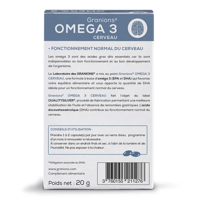 Granions Omega 3 cerveau fait l’objet du label QUALITYSILVER : procédé de fabrication permettant une meilleure stabilisation de l’huile et l’absence de remontées gastriques. Nous vous garantissons ainsi une huile pure et d’origine française stabilisée avec les meilleures méthodes. L’acide docosahexaénoïque (DHA) contribue au fonctionnement normal du cerveau.