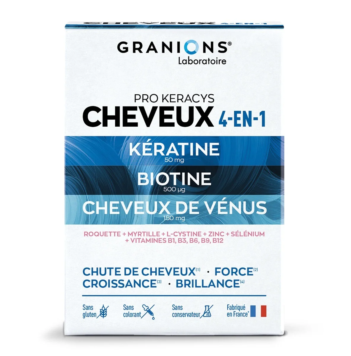Plusieurs facteurs peuvent être à l’origine d’une diminution de la densité capillaire, de manière progressive (hormonale, héréditaire) ou réactionnelle (stress, grossesse, changement de régime alimentaire, saisonnalité…). Des cheveux trop fins et cassants, sont souvent révélateurs d’un dérèglement de l’apport en nutriments. Afin de conserver une chevelure saine et forte, le Laboratoire des GRANIONS a développé une formule 4-EN-1 afin d’agir sur ces différents facteurs :