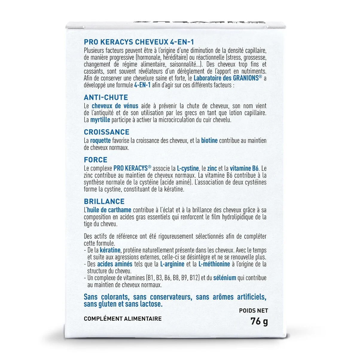 - FORCE : Le complexe PRO KERACYS® associe la L-cystine, le zinc et la vitamine B6. Le zinc contribue au maintien de cheveux normaux. La vitamine B6 contribue à la synthèse normale de la cystéine (acide aminé). L’association de deux cystéines forme la cystine, constituant de la kératine.