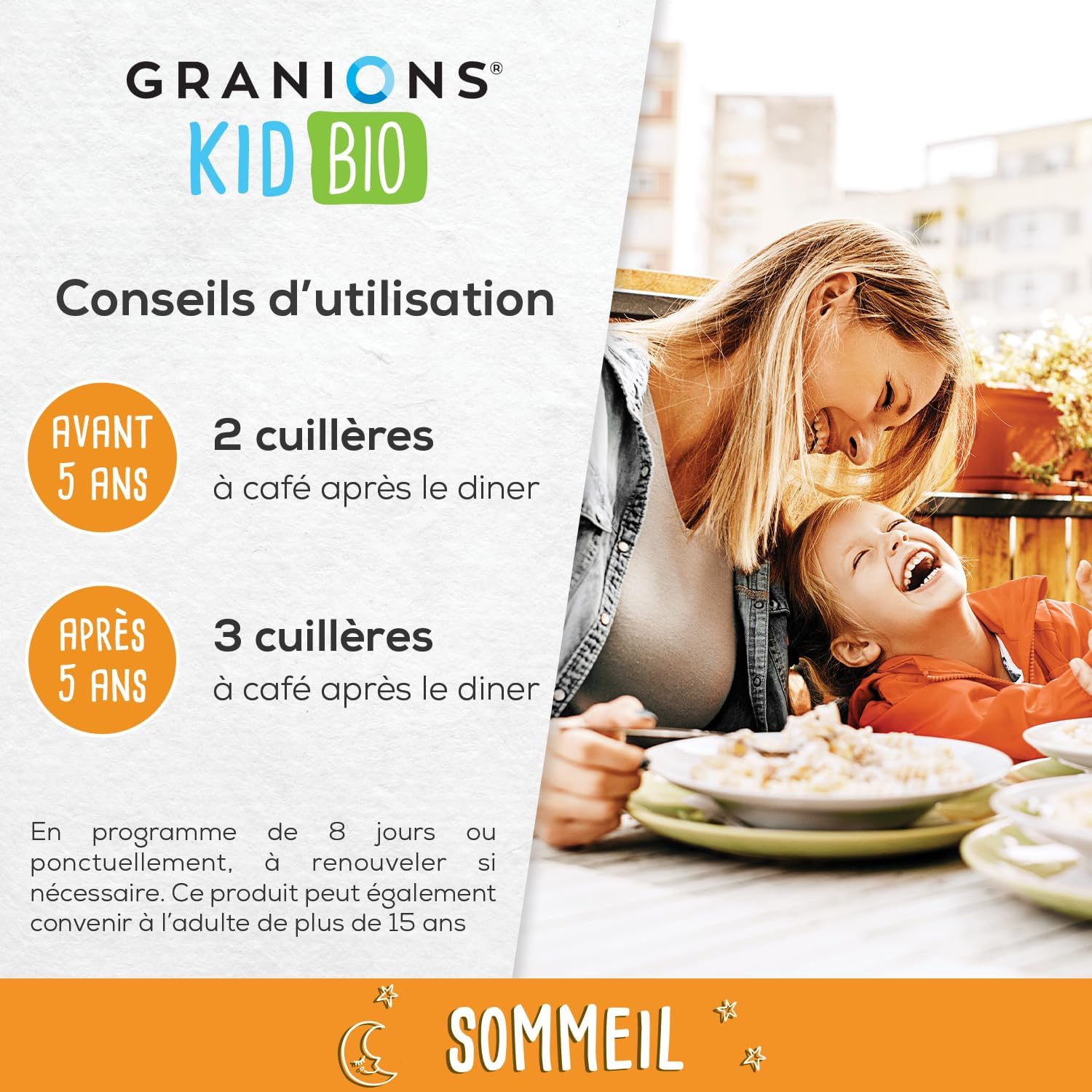 GRANIONS KID BIO IMMUNITÉ, au bon goût de banane, est un complément alimentaire BIO, à base d’extraits de plantes : cynorrhodon, jus d’argousier, cassis, thym, acérola.
