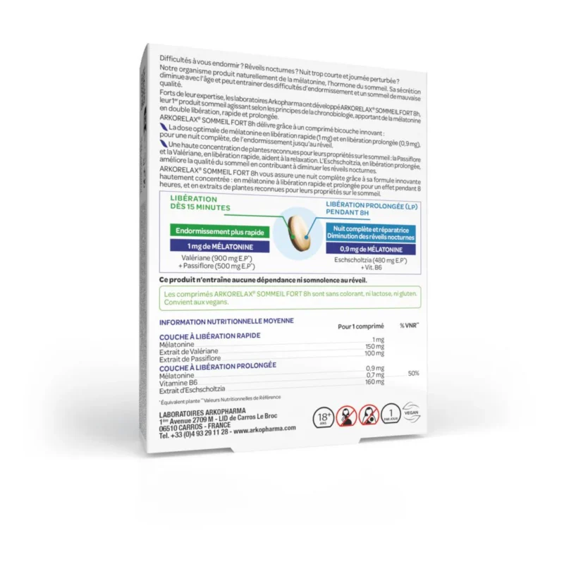Ingrédients : L-tryptophane, gélule d’origine végétale, gomme d’acacia (agent de charge), chlorhydrate de pyridoxine (vitamine B6).