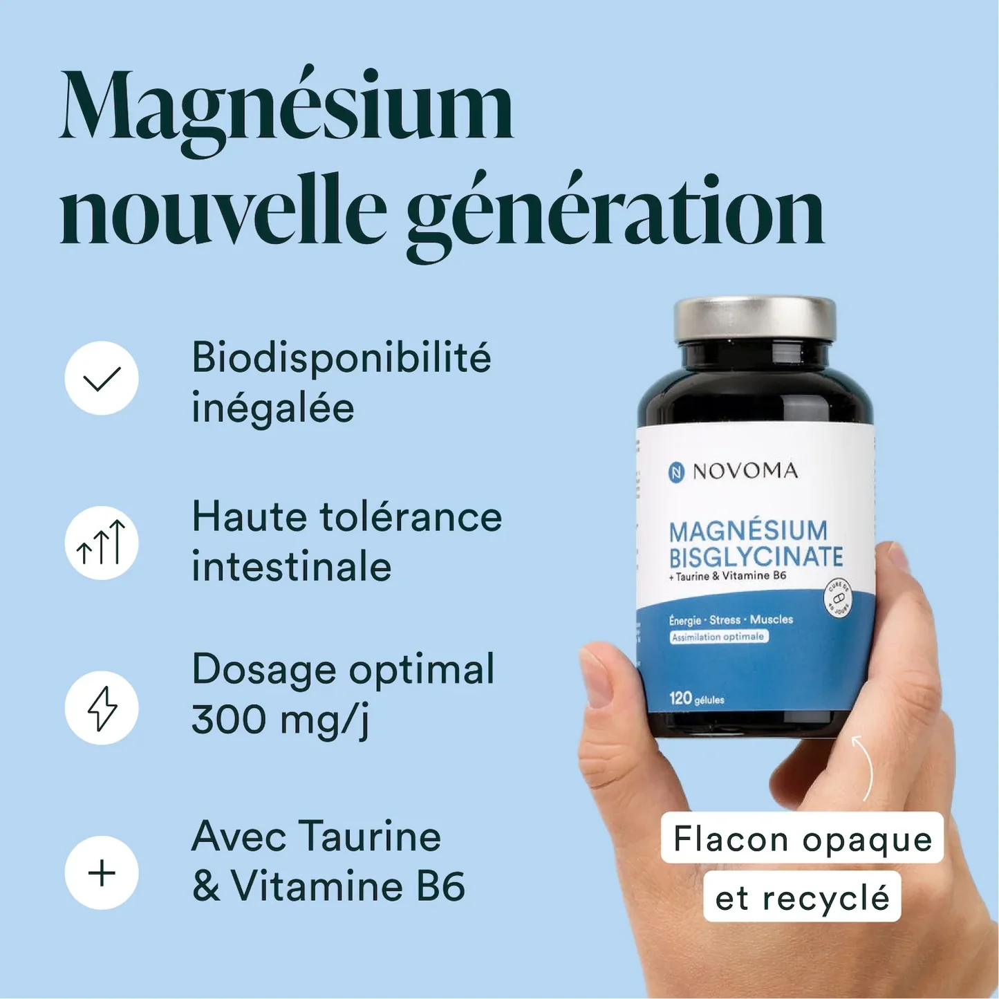 Pour vous aider à combler vos besoins en magnésium, nous avons sélectionné une forme hautement biodisponible de magnésium : le magnésium bisglycinate. Elle est facilement absorbée par l’organisme et ne cause pas d’inconforts digestifs.