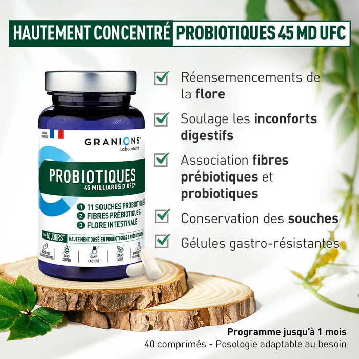 Granions®  Probiotiques 45MDS contient 11 souches soigneusement sélectionnées, avec une concentration de 45 milliards d’UFC par jour. Cette diversité maximise la recolonisation intestinale et la stabilité du microbiote. Un microbiote varié est associé à une meilleure tolérance alimentaire et une diminution des troubles gastro-intestinaux chroniques.